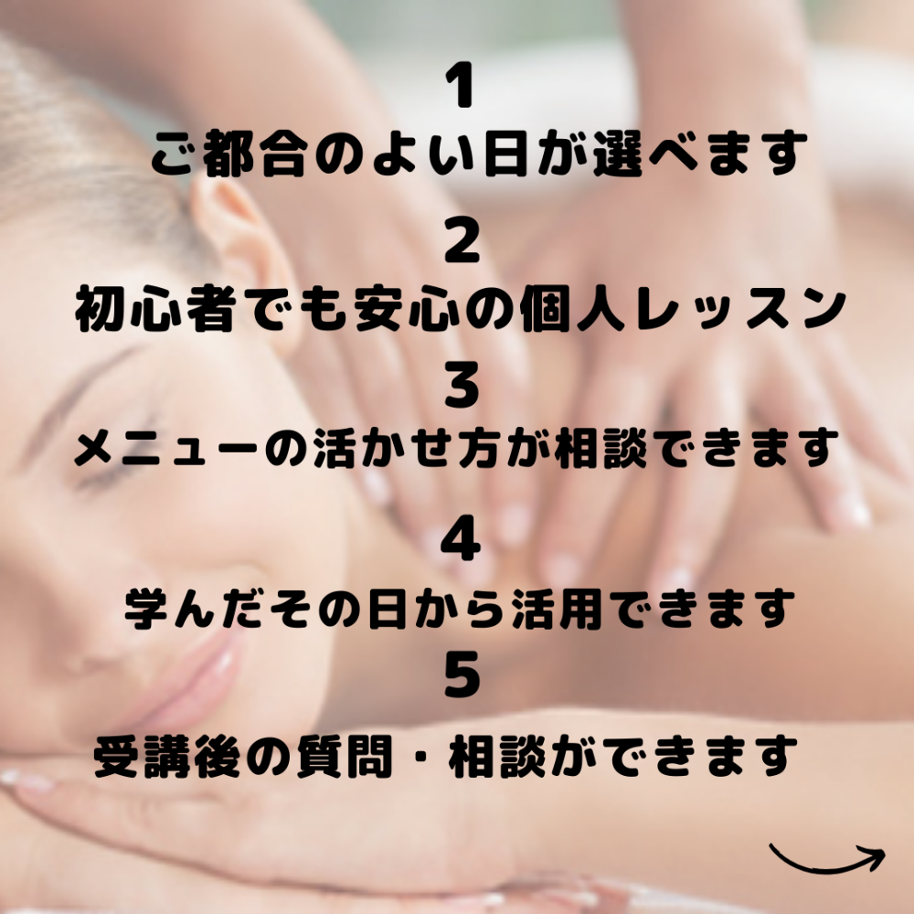 「内側から美と健康を引き出す、今注目のセラピー技術」** 腸の働きを整えることで、全身の健康や美肌をサポートする腸セラピーは、近年注目を集めています。この講座では、腸の構造や機能の基礎知識を学び、効果的なマッサージ技術や施術のポイントを実践的に指導します。心と体のバランスを整えるこの技術は、多くの方に喜ばれる施術となるでしょう。